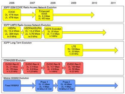 Выигрыш в пропускной способности WiMAX у HSDPA на равном расстоянии от базовой станции пока не так очевиден. Это связано в первую очередь с тем, что для WiMAX доступно пока не так много частотных диапазонов. Однако если HSDPA, являясь эволюционным шагом в развитии WCDMA, приближается к порогу спектральной эффективности, то у WiMAX возможных путей развития значительно больше — это и новые частотные диапазоны (от 10 до 66 ГГц, помните?), и новые модуляционные схемы (а также комбинации с предыдущими), и MIMO (multiple-input-multiple output).