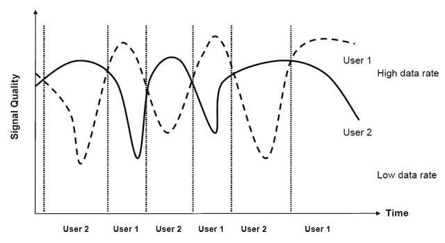 Заметное «неравноправие», хорошо видное на рисунке, связано с тем, что приоритет предоставления каналов отдается тем пользователям, у которых наилучшее качество сигнала. Таким образом, «быстрые» пользователи «получают» кусочек трафика и «переваривают» его в то время, пока уровень сигнала невысок, в ожидании «лучших времен». За уровнем сигнала, напомним, система следит с интервалом в 2 мс.