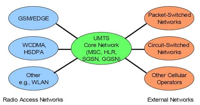 Как видно на втором рисунке, основу ядра UMTS составляют контроллеры базовой станции (BSC, Base Stantion Controller), центр коммутации мобильных телефонов (MSC, Mobile Switching Center), регистр домашних пользователей (HLR, Home Location Register), сервер коммутации пакетов (SGSN, Serving GPRS Support Node) и маршрутизатор доступа в интернет (GGSN, Gateway GPRS Support Node). Все эти узлы унаследованы UMTS от GSM/EDGE, более того, как видим, интеграция с WLAN возможна уже на этом этапе.