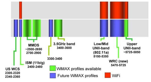 Рис. 5. Доступные и планируемые частотные диапазоны для WiMAX.