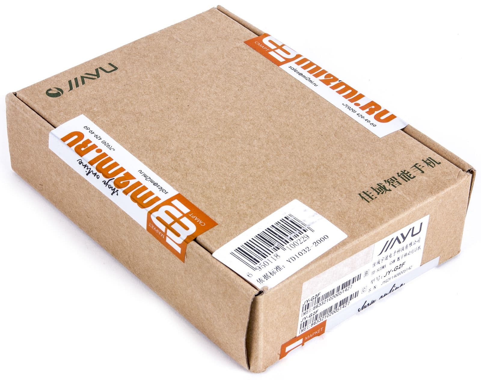 Компания-производитель не утруждает себя соблюдением единообразия в упаковках своих изделий: коробки протестированных нами Jiayu G3, Jiayu G4 и вот теперь Jiayu G2F кардинально отличаются друг от друга. Но если упаковки Jiayu G3 и Jiayu G4 вполне соответствуют привычным представлениям о том, какими должны поступать на полки магазинов «приличные» смартфоны, то упаковка бюджетного Jiayu G2F выбивается из рамок этих общепринятых норм. Смартфон продается в нарочито простой, неряшливой утилитарного вида грубо сложенной коробке из неокрашенного и неоклеенного картона, которую и упаковкой-то назвать язык не поворачивается. Возможно, таким образом производители хотели подчеркнуть, что в стоимость этого недорогого устройства не включено ничего «лишнего».