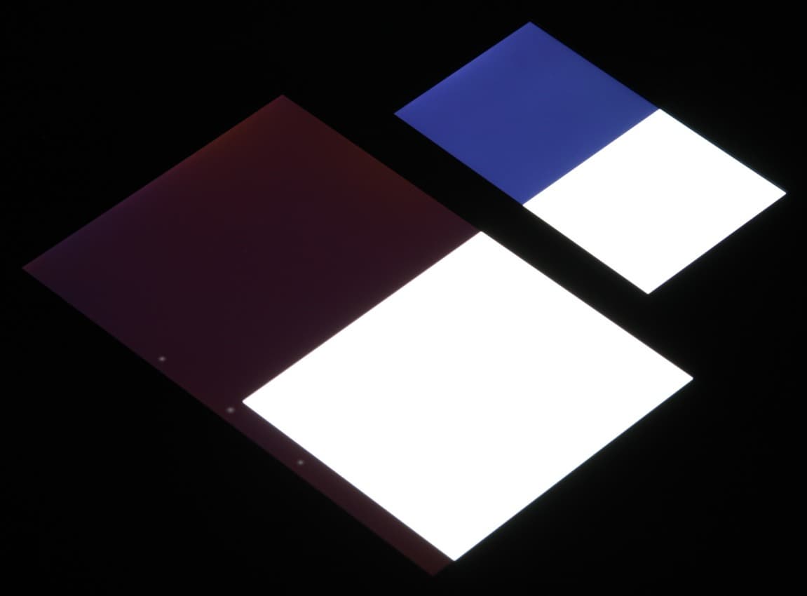 Яркость под углом у экранов уменьшилась (как минимум в 5 раз, исходя из разницы в выдержке), но в случае JiaYu G2F падение яркости заметно больше, чем у Nexus 7. Черное поле при отклонении по диагонали высветляется сильно и приобретает фиолетовый или красно-фиолетовый оттенок. Фотография с Nexus 7 для сравнения это показывает (яркость белых участков в перпендикулярном направлении у экранов одинаковая!):