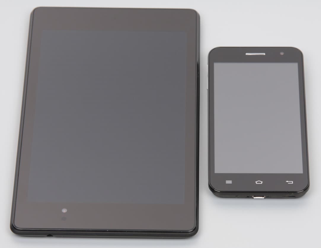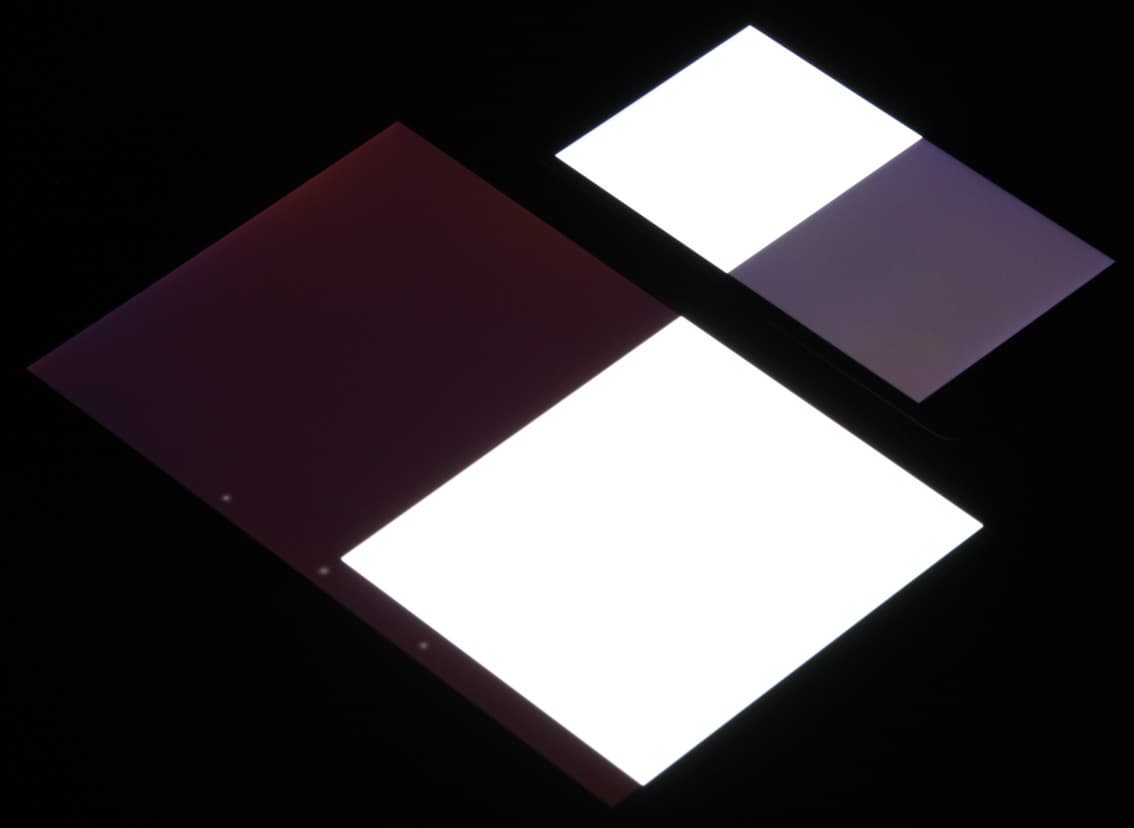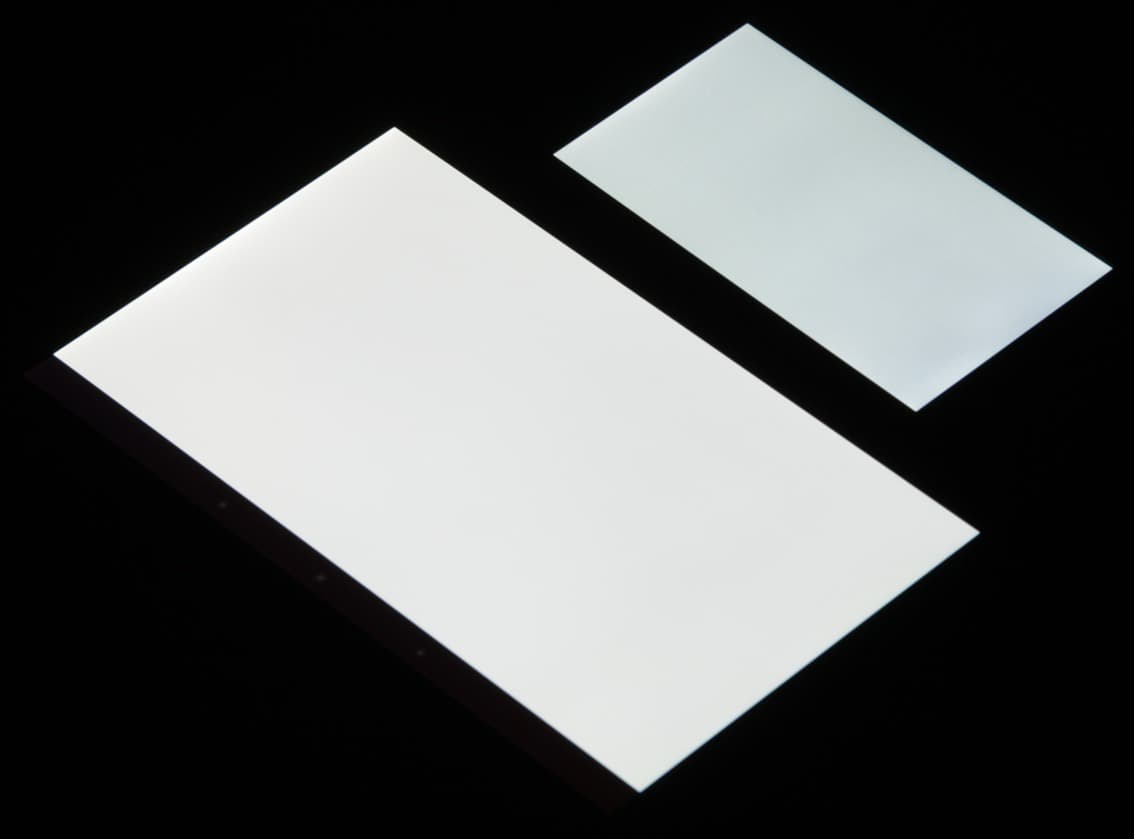 Лицевая поверхность экрана выполнена в виде стеклянной пластины с зеркально-гладкой поверхностью, устойчивой к появлению царапин. Судя по отражению объектов, имеется какой-то антибликовый фильтр, который по снижению яркости отражения заметно хуже, чем у Google Nexus 7 (2013) (далее просто Nexus 7). Поверхность самой матрицы под стеклом слегка матовая, поэтому экран отражает как прямые источники света (внешней поверхностью), так и рассеянный свет (поверхностью матрицы), это уменьшает читаемость в условиях сильной внешней засветки. Для наглядности приведем фотографию, на которой в выключенных экранах отражается белая поверхность (слева — Nexus 7, справа — JiaYu G2F, далее их можно различать по размеру):