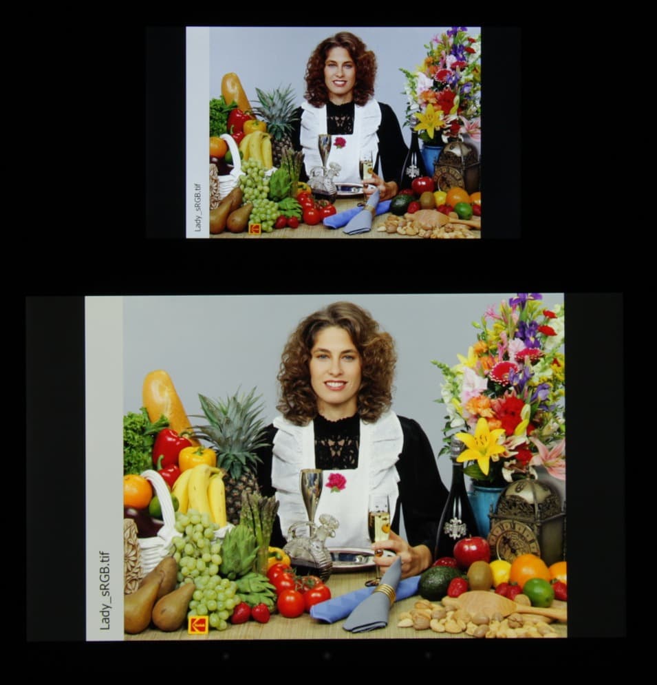 Интервалы между кадрами (или группами кадров) чередуются немного неравномерно и в случае файлов с 50 и 60 кадр/с некоторая часть кадров всегда пропускается. При воспроизведении видеофайлов 720p и 1080p изображение собственно видеофайла выводится точно по границе экрана. Отображаемый на экране диапазон яркости немного не соответствует стандартному диапазону (то есть диапазону 16—235) — в тенях пара-тройка оттенков неотличима по яркости от черного цвета, но в светах различаются все градации оттенков. В случае видеофайлов с разрешением 720p исходное разрешение формально сохраняется как по горизонтали, так и по вертикали. Однако влияние белого пикселя сказывается: вертикальные линии на мирах слегка неровные, а горизонтальные плохо разделены. Напомним, что разрешение экрана производитель указывает, считая белый пиксель и триаду из цветных субпикселей равнозначными, что в общем-то, не совсем верно.