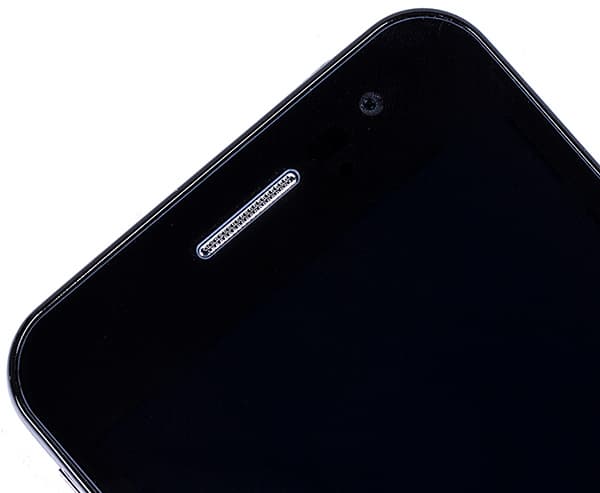 Вся передняя панель полностью прикрыта снаружи защитным стеклом Corning Gorilla Glass 2, устойчивым к появлению царапин и сколов. Под ним видны глазок фронтальной камеры и сенсоры, а также в нем проделана продольная прорезь для решетки разговорного динамика — все они расположены в верхней части над экраном.