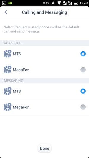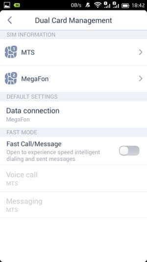 Работа с двумя SIM-картами в меню организована по знакомому принципу: можно любую из SIM-карт назначить основной для организации голосовых звонков, передачи данных или отправки SMS-сообщений; при наборе номера также можно выбрать желаемую карту в контекстном подменю. Работа с двумя SIM-картами организована по привычному стандарту Dual SIM Dual Standby, когда обе карты могут находиться в активном режиме ожидания, но одновременно работать не могут — радиомодуль здесь только один.