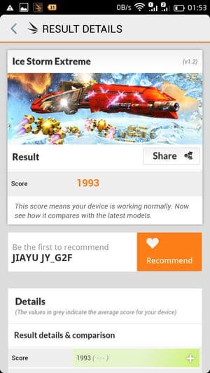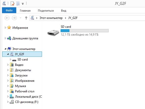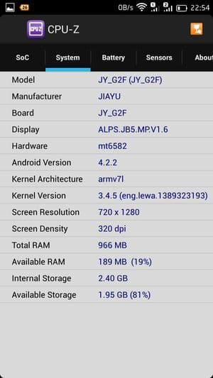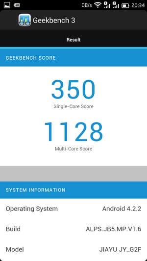 Аппаратная платформа Jiayu G2F строится на базе однокристальной системы (SoC) MediaTek MT6582. Центральный процессор здесь имеет 4 ядра ARM Cortex-A7, работающих на частоте 1,3 ГГц. Оперативной памяти в устройстве предусмотрен 1 ГБ, а свободная системная память составляет около 2 ГБ из номинально обозначенных 4 ГБ. Любопытно, что вся встроенная память отформатирована в виде одного системного раздела, так что без root-прав она пользователю не доступна. То есть если не вставить в устройство карточку памяти microSD, аппарат откажется даже элементарно сохранить скриншот — ему просто некуда. Так что без вставленной карты памяти смартфон Jiayu G2F оказывается совершенно бесполезен. Если подсоединить аппарат к компьютеру, то файловый менеджер также увидит в качестве флэш-памяти устройства только память вставленной карточки (если она вставлена).