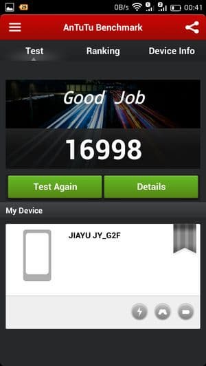 Емкость литий-ионной батареи, установленной в Jiayu G2F, составляет 2200 мА·ч. По результатам тестов испытуемый продемонстрировал весьма плачевные результаты длительности автономной работы — гораздо хуже любых других аналогичных по характеристикам аппаратов со схожей емкостью батареи. Совершенно явно тут не обошлось без проблем с программным обеспечением, потому что результат просто не может быть настолько плохим: заряд батареи смартфона тает прямо-таки на глазах, и наш тестируемый экземпляр категорически не доживал до конца светового дня без дополнительной подзарядки. Скорее всего, с обновлением прошивок тут просто обязано что-то измениться в лучшую сторону, ибо «так жить нельзя».