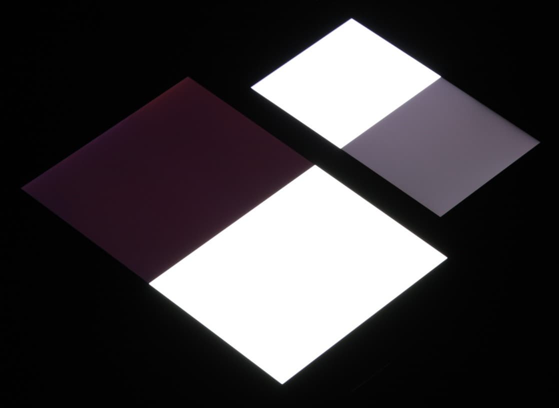 Яркость под углом у экранов уменьшилась (как минимум в 5 раз, исходя из разницы в выдержке), но у Jolla C экран немного темнее. Черное поле при отклонении по диагонали высветляется сильно и приобретает красно-фиолетовый оттенок. Фотографии ниже это демонстрируют (яркость белых участков в перпендикулярном плоскости экранов направлении одинаковая!):