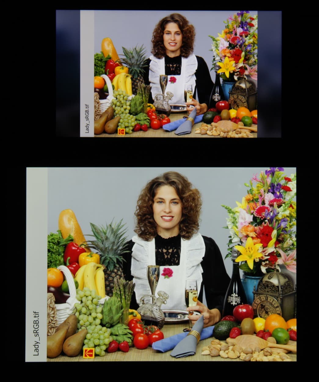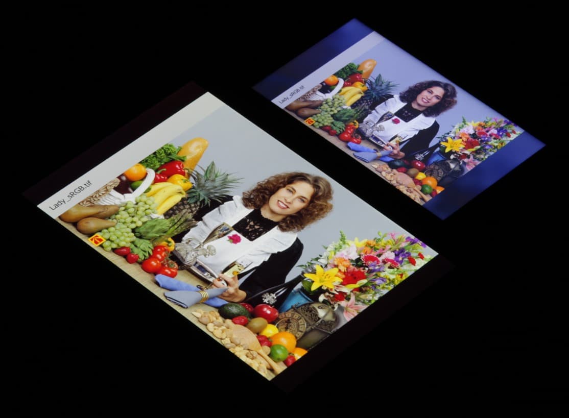 В итоге цвета имеют почти естественную насыщенность. Баланс оттенков на шкале серого приемлемый, так как цветовая температура несильно выше стандартных 6500 К, и отклонение от спектра абсолютно черного тела (ΔE) меньше 10 на большинстве оттенков серого, что для потребительского устройства считается хорошим показателем. При этом цветовая температура и ΔE мало изменяются от оттенка к оттенку — это положительно сказывается на визуальной оценке цветового баланса. (Самые темные области шкалы серого можно не учитывать, так как там баланс цветов не имеет большого значения, да и погрешность измерений цветовых характеристик на низкой яркости большая.)