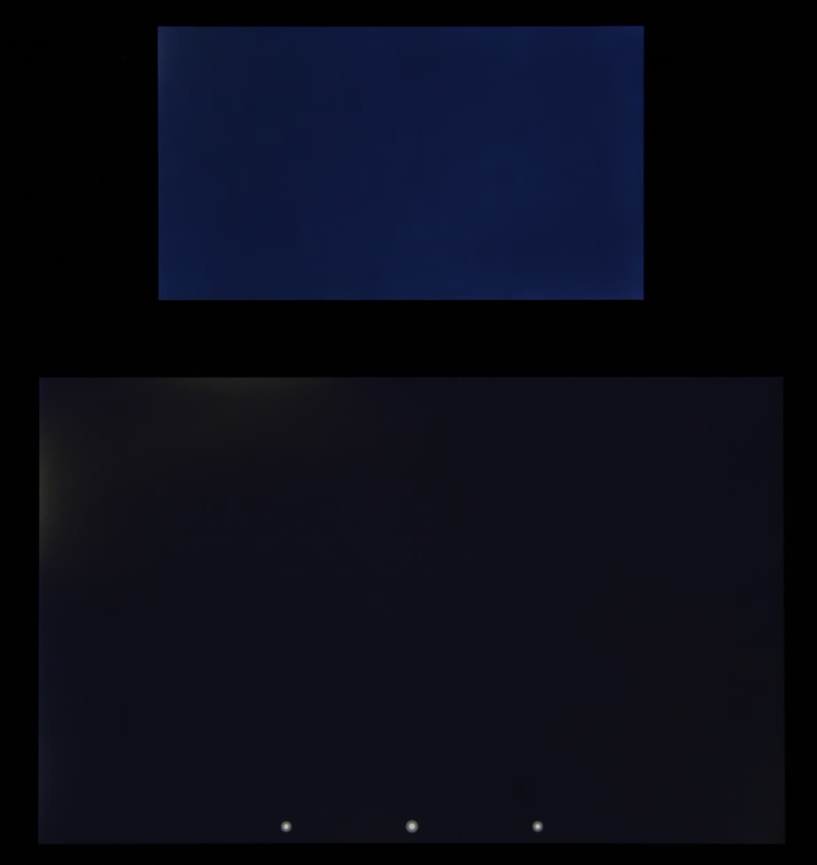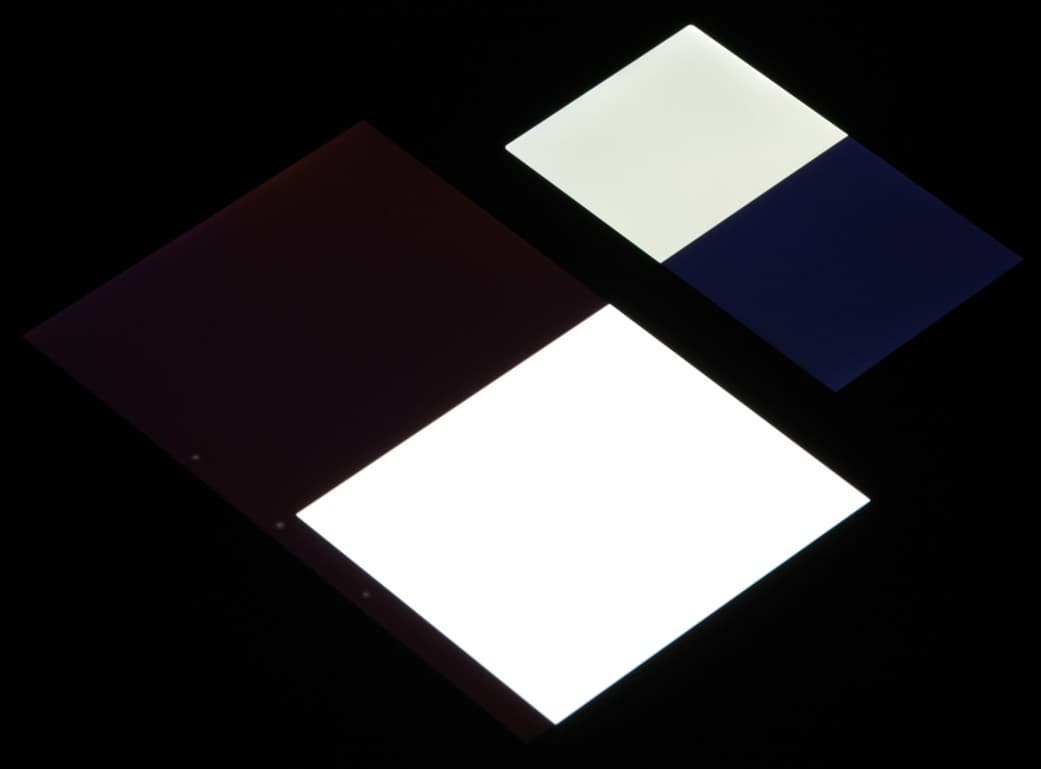 Яркость у Jolla под углом уменьшилась заметно больше, чем в случае Nexus 7. Черное поле при отклонении по диагонали высветляется слабо и приобретает фиолетовый оттенок. Фотографии ниже это демонстрируют (яркость белых участков в перпендикулярном плоскости экранов направлении у экранов одинаковая!):