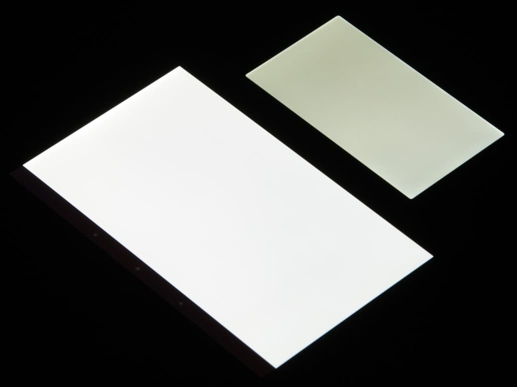 Лицевая поверхность экрана выполнена в виде стеклянной пластины с зеркально-гладкой поверхностью, устойчивой к появлению царапин. Судя по отражению объектов, имеется эффективный антибликовый фильтр, который по снижению яркости отражения не хуже, чем у Google Nexus 7 (2013) (далее просто Nexus 7). Для наглядности приведем фотографию, на которой в выключенных экранах отражается белая поверхность (слева — Nexus 7, справа — Jolla, далее их можно различать по размеру):