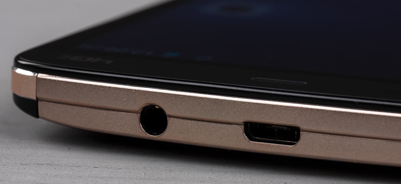 Универсальный разъем Micro-USB размещен на верхнем торце, аудиовыход для наушников 3,5 мм врезан сюда же. Расположены они, пожалуй, слишком уж близко друг к другу, и это может создать некоторые неудобства при одновременном подключении обоих штекеров. В качестве приятного бонуса разъем Micro-USB здесь еще и поддерживает режим подключения внешних устройств (USB OTG), так что через вложенный в комплект переходник можно подключить флэш-накопитель и считывать информацию прямо с него. Никаких заглушек на своих разъемах смартфон не имеет, так как не оборудован защитой от воды и грязи. Крепления для ремешка также не имеется.