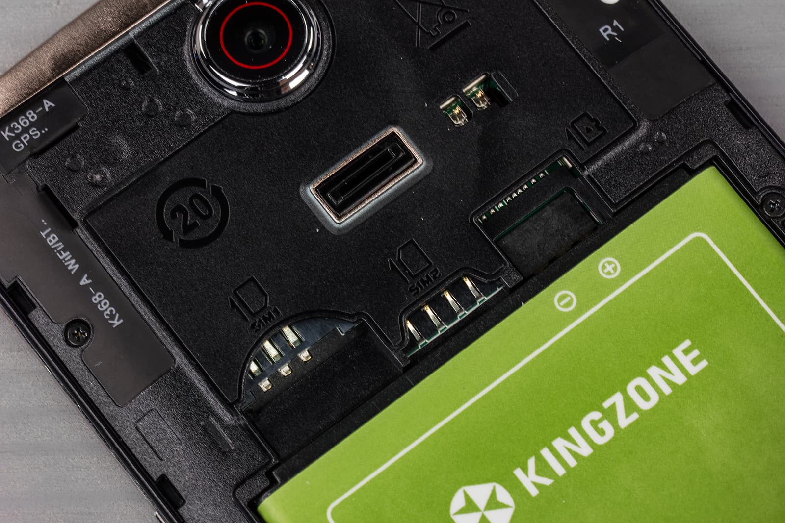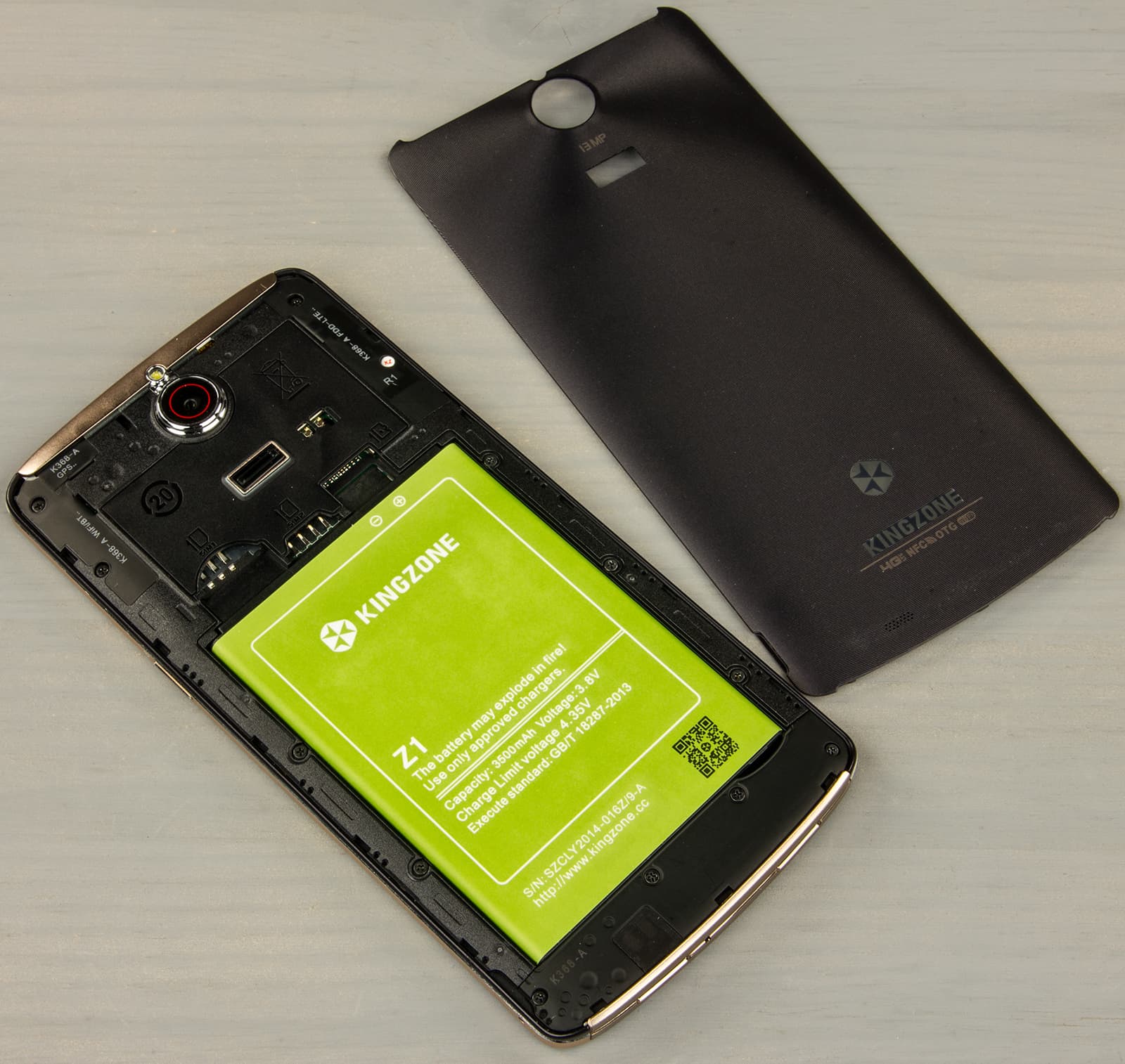 Литий-полимерная батарея, установленная в Kingzone Z1, имеет огромную (для смартфонов) емкость в 3500 мА·ч — по крайней мере, так написано на этикетке на самой батарее. Однако после всего того обмана разработчиков, которым оказались окутаны многие реальные характеристики сего аппарата, и эти данные кажутся неправдоподобными. В любом случае, аппарату со столь объемной батареей не удалось продемонстрировать каких-либо рекордных показателей в тестах, и есть подозрение, что реальный объем установленного аккумулятора в действительности меньше, чем заявлено.