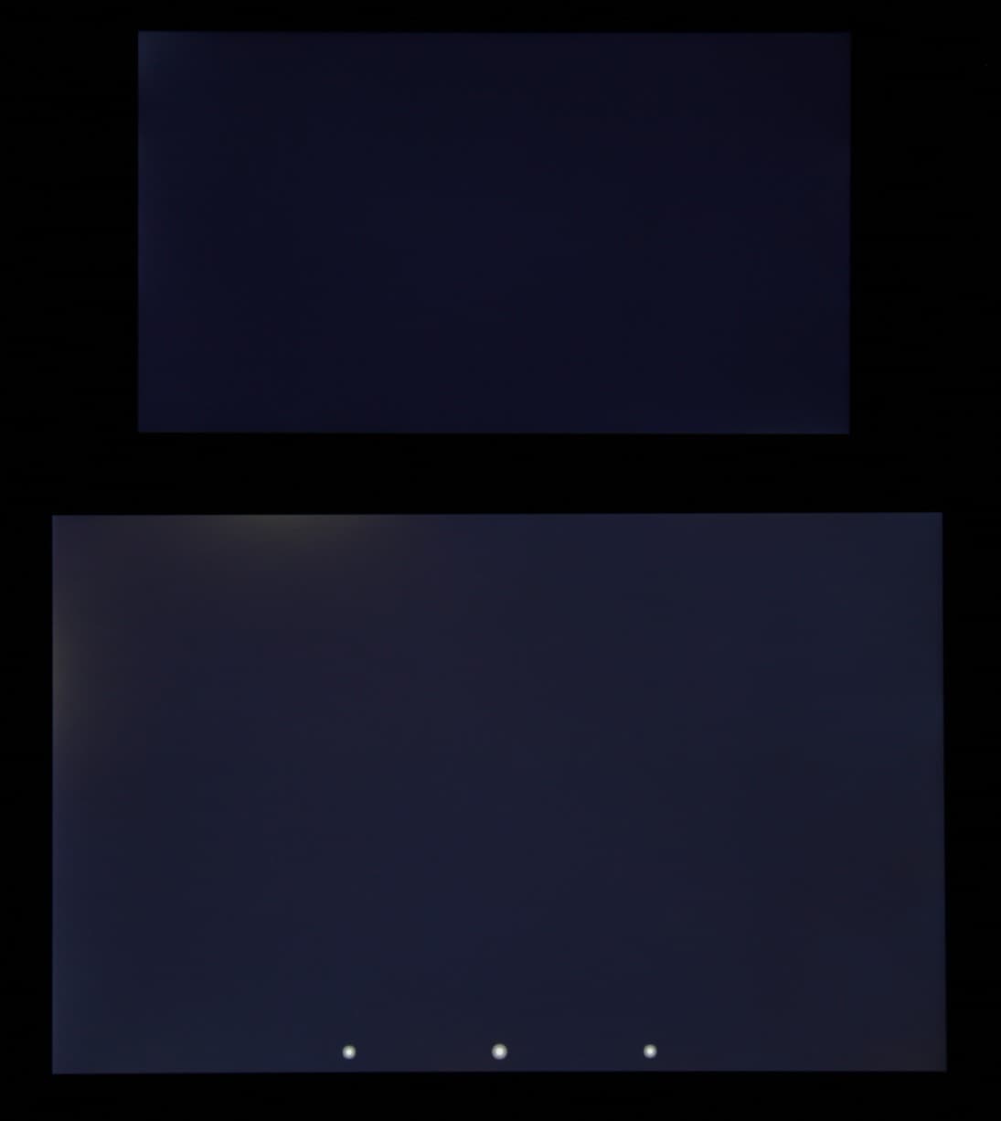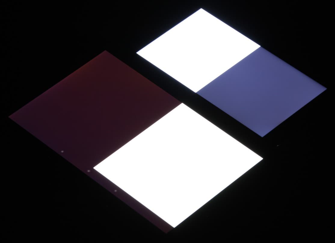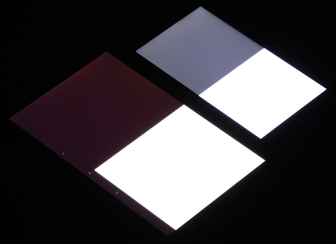 Яркость под углом у экранов уменьшилась (как минимум в 5 раз, исходя из разницы в выдержке), но у Kingzone Z1 экран немного светлее (средняя яркость по фотографиям 238 против 228 у Nexus 7). Черное поле при отклонении по диагонали высветляется сильно и приобретает фиолетовый оттенок или остается примерно нейтрально-серым. Фотографии ниже это демонстрируют (яркость белых участков в перпендикулярном плоскости экранов направлении одинаковая!):