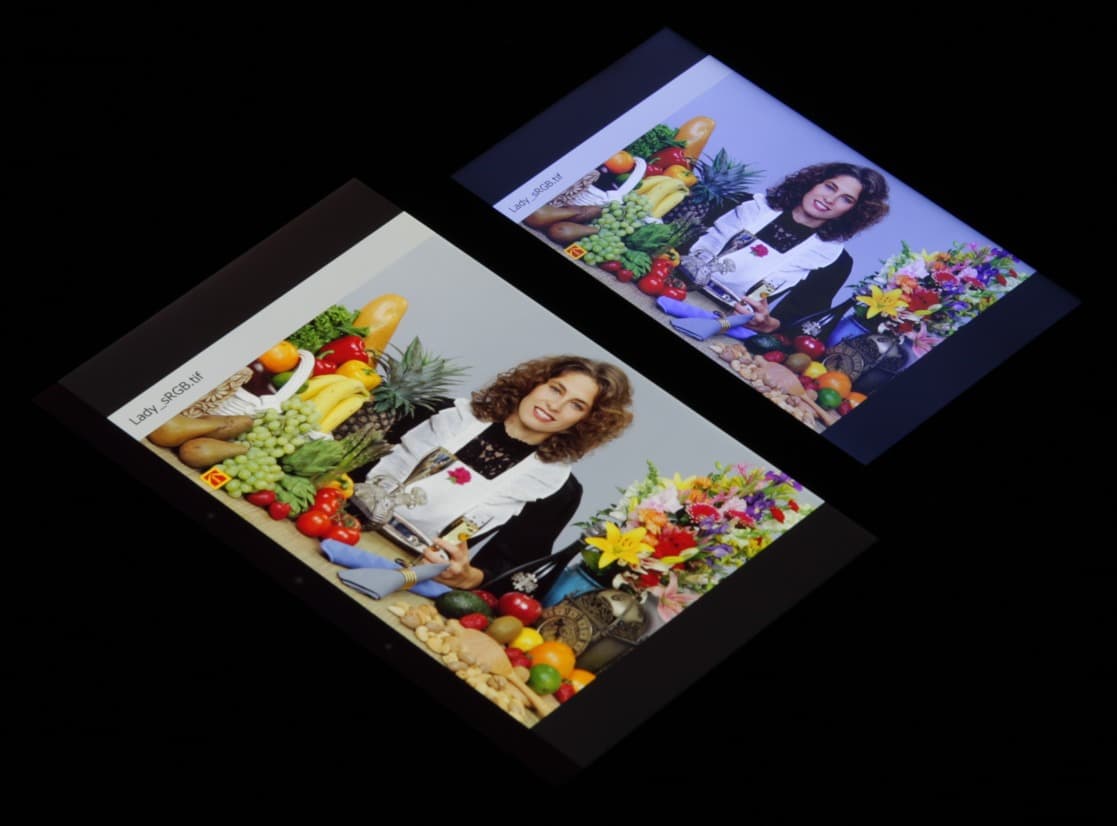 В итоге цвета имеют естественную насыщенность. Баланс оттенков на шкале серого ужасный, так как цветовая температура гораздо выше стандартных 6500 К. Правда, отклонение от спектра абсолютно черного тела (ΔE) меньше 10, что для потребительского устройства считается приемлемым показателем. При этом хотя бы ΔE мало изменяется от оттенка к оттенку — это положительно сказывается на визуальной оценке цветового баланса. (Самые темные области шкалы серого можно не учитывать, так как там баланс цветов не имеет большого значения, да и погрешность измерений цветовых характеристик на низкой яркости большая.)
