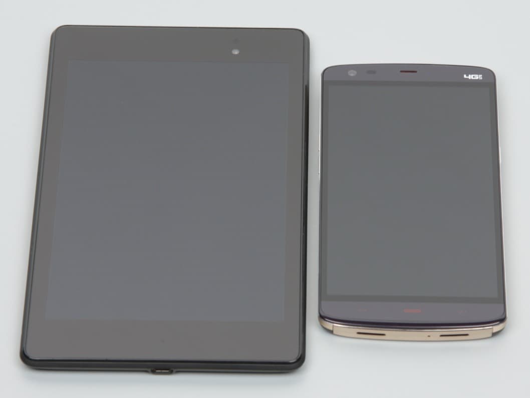 Лицевая поверхность экрана выполнена в виде стеклянной пластины с зеркально-гладкой поверхностью, устойчивой к появлению царапин. Судя по отражению объектов антибликовые свойства экрана не хуже, чем у экрана Google Nexus 7 (2013) (далее просто Nexus 7). Для наглядности приведем фотографию, на которой в выключенных экранах отражается белая поверхность (слева — Nexus 7, справа — Kingzone Z1, далее их можно различать по размеру):
