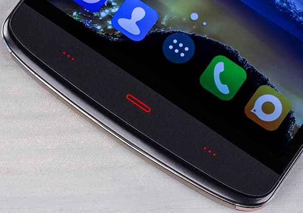 Передняя панель почти полностью прикрыта плоским защитным стеклом без бортиков. Согласно официальным обещаниям на сайте, это Corning Gorilla Glass 3, но кто ж им теперь на слово поверит. «Почти», потому что в самом низу остается неприкрытым этакий пластиковый наплыв — часть рамки вокруг экрана здесь значительно расширяется, немного усложняя таким образом дизайн, что в общем выглядит неплохо. Кнопки управления здесь сенсорные, имеют необычные пиктограммы из овала и троеточий, подсвечиваются кроваво-красным светом, что в целом вписывается в общую картину, создаваемую сочетанием золотистого металла и черного пластика. Надо признать, что белый вариант окраса Kingzone Z1 все же выглядит не столь эффектно, как этот черно-золотистый, на котором красные вставки оказываются более к месту.