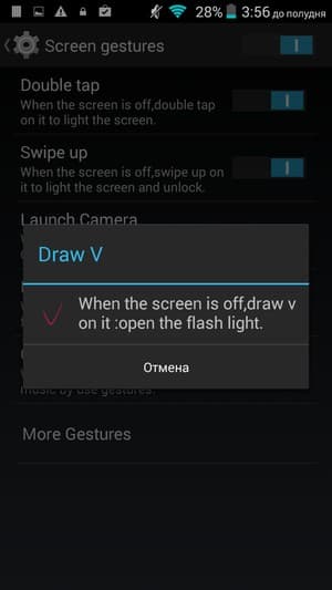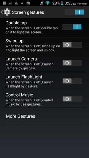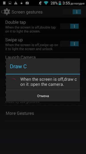 Добавлена также поддержка управления жестами, все настройки по работе с жестами выделены в отдельный раздел меню. Сюда вошли как привычные двойное постукивание по стеклу, или разнообразные переворачивания и накрывания ладонью, так и разнообразные пассы в виде значков и букв, с помощью которых можно вызвать отдельные приложения и программы (например, плеер или камеру).