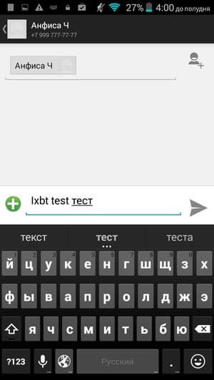Самопроизвольных перезагрузок/выключений за время тестирования не наблюдалось, с этим проблем нет, интерфейс работает быстро, задержек и заторможенности не замечено. Раскладка и расположение клавиш стандартные: переключение языков осуществляется нажатием на специальную кнопку с изображением глобуса, выделенного верхнего ряда с цифрами нет. Телефонное приложение поддерживает Smart Dial, то есть во время набора телефонного номера сразу осуществляется и поиск по контактам, а вот любимого многими пользователями безотрывного способа ввода типа Swype здесь нет.