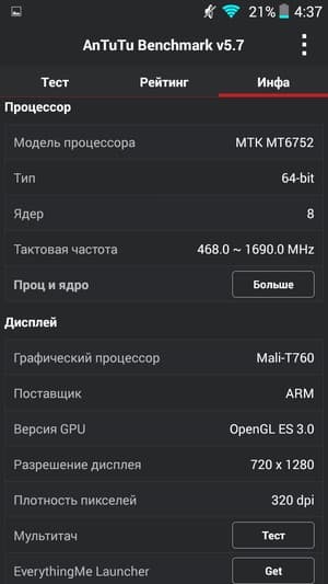 | Kingzone Z1 (Mediatek MT6752/8 ядер Cortex-A53 @1,7 ГГц) | Zopo ZP920 (Mediatek MT6752/8 ядер Cortex-A53 @1,7 ГГц) | Meizu M1 Note (Mediatek MT6752/8 ядер Cortex-A53 @1,7 ГГц) | Huawei Honor 6 (HiSilicon Kirin 920/4 ядра Cortex-A15 @1,7 ГГц) | HTC Desire 820s (Mediatek MT6752/8 ядер Cortex-A53 @1,7 ГГц) | |