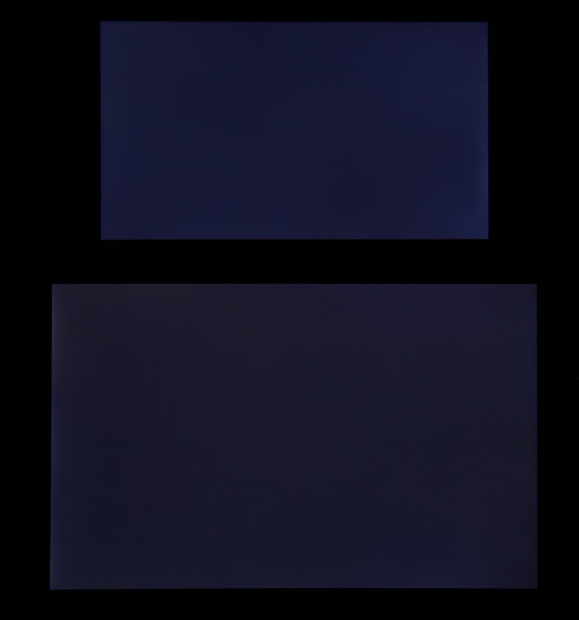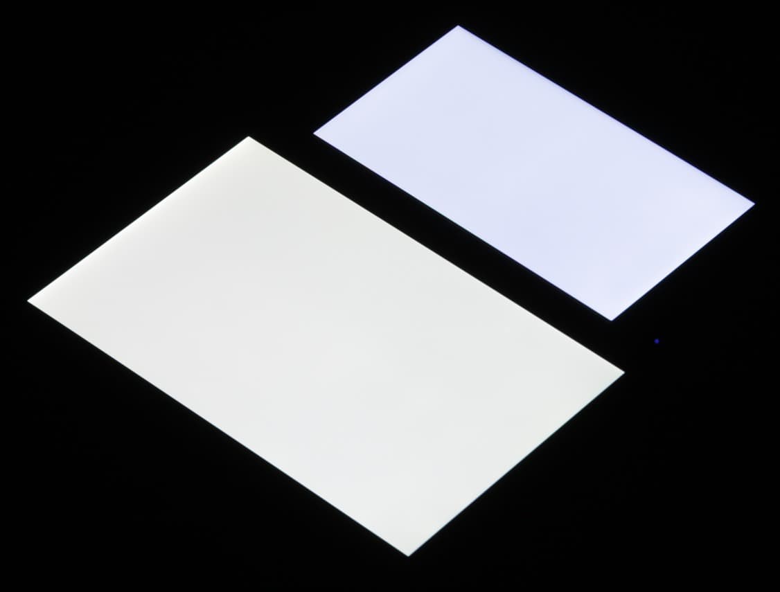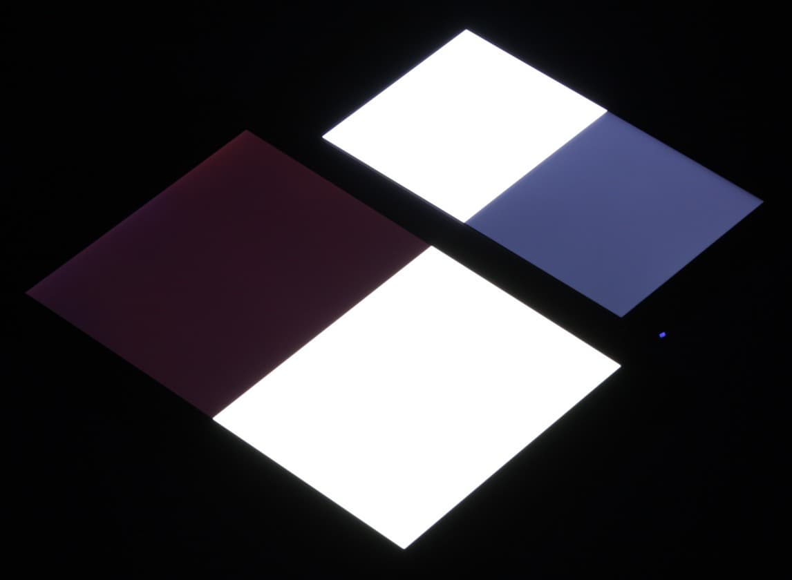 Яркость под углом у экранов уменьшилась (как минимум в 5 раз, исходя из разницы в выдержке), но у Leagoo M5 Plus экран немного темнее. Черное поле при отклонении по диагонали высветляется сильно и приобретает фиолетовый оттенок. Фотографии ниже это демонстрируют (яркость белых участков в перпендикулярном плоскости экранов направлении одинаковая!):