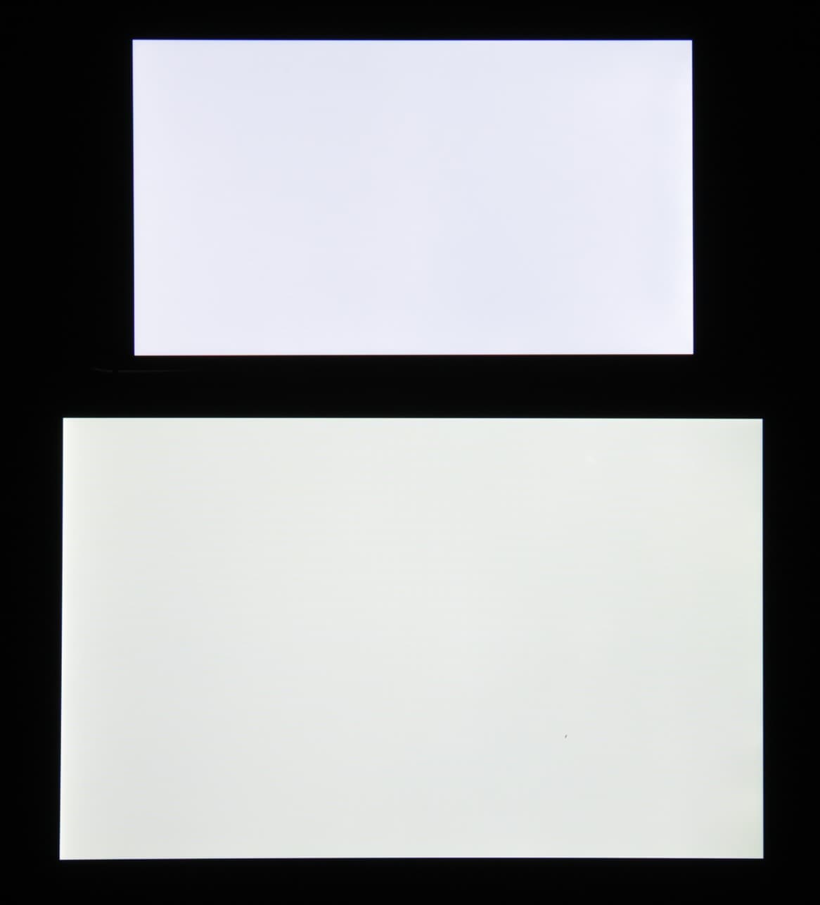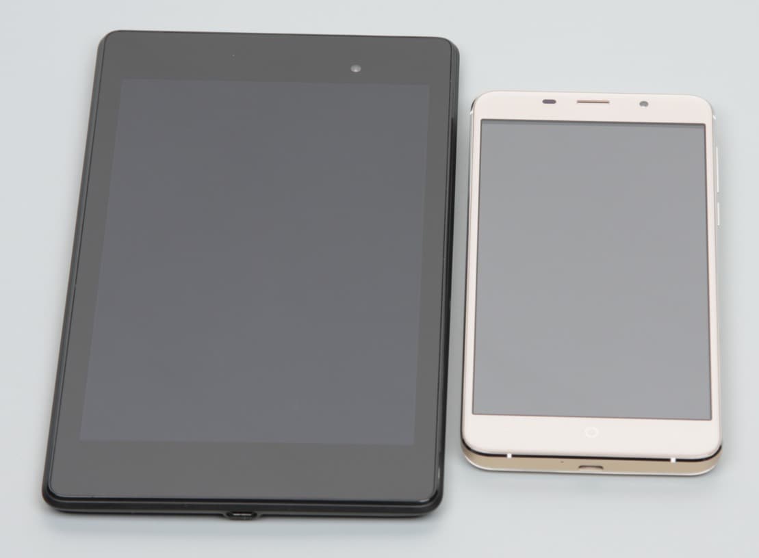 Лицевая поверхность экрана выполнена в виде стеклянной пластины с зеркально-гладкой поверхностью, устойчивой к появлению царапин. Судя по отражению объектов, антибликовые свойства экрана гораздо хуже, чем у экрана Google Nexus 7 (2013) (ниже просто Nexus 7). Для наглядности приведем фотографию, на которой в выключенных экранах отражается белая поверхность (слева — Nexus 7, справа — Leagoo M5 Plus, далее их можно различать по размеру):