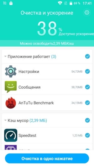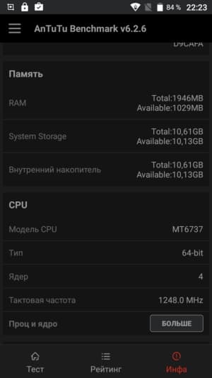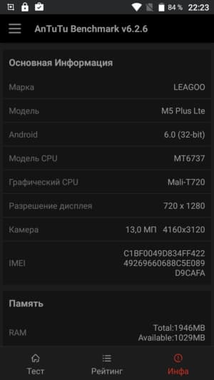 Аппаратная платформа Leagoo M5 Plus строится на базе SoC MediaTek MT6737. В конфигурацию данного чипа входит четыре процессорных ядра Cortex-A53, работающих на частоте до 1,25 ГГц. За обработку графики отвечает видеоускоритель Mali-T720. Объем ОЗУ равняется 2 ГБ, что по современным меркам немного, а пользовательское хранилище изначально составляет менее 10 ГБ. Около 1,1 из 1,9 ГБ ОЗУ в реальности остаются свободными после перезагрузки, очистки памяти и закрытия всех приложений.