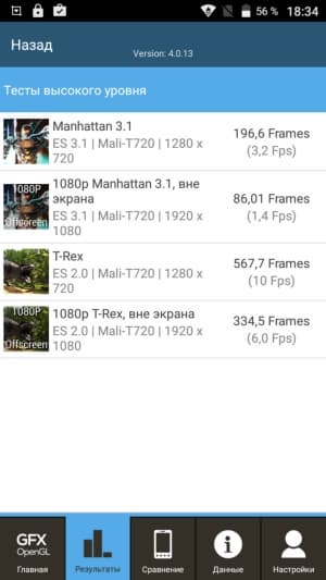 Мы уже не раз встречались с MediaTek MT6737, это свежая платформа, пришедшая на смену SoC MediaTek MT6735, ориентированной на ультрабюджетный класс устройств. Соответственно, ждать от нее высоких показателей нет смысла, все тесты это наглядно демонстрируют. Возможности данной SoC очень скромны, это даже не средний уровень, а низкий. Игры идут лишь на минимальных настройках, и все равно в требовательные Dead Trigger 2 или Modern Combat 5 можно поиграть только с небольшими притормаживаниями. Никакого запаса на будущее у этой слабенькой платформы нет.