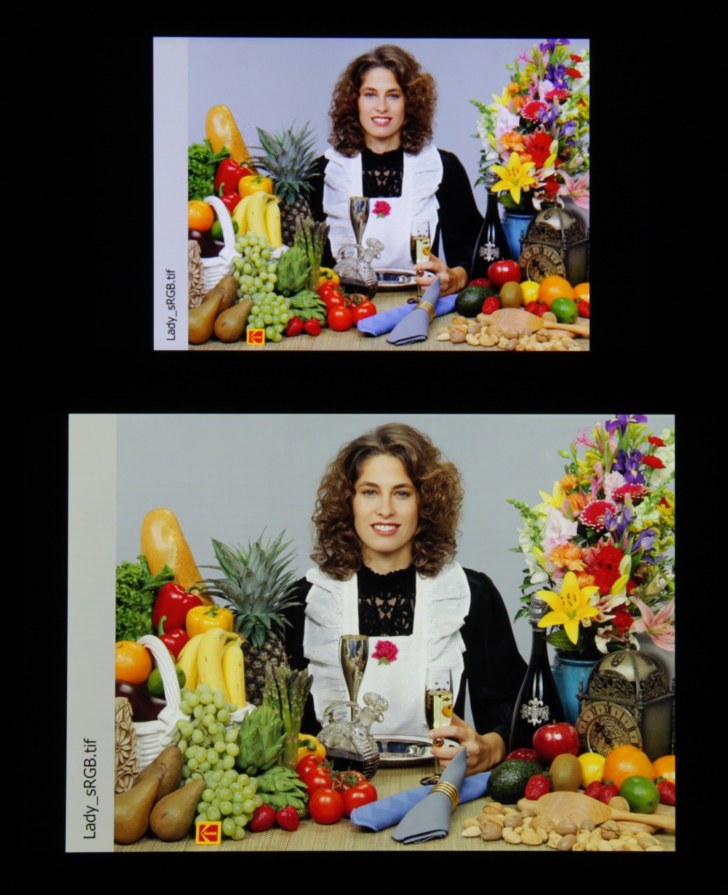 В итоге цвета имеют естественную насыщенность. Баланс оттенков на шкале серого плохой, так как цветовая температура сильно выше стандартных 6500 К, но хоть отклонение от спектра абсолютно черного тела (ΔE) меньше 10 на большинстве оттенков серого, что для потребительского устройства считается приемлемым показателем. (Самые темные области шкалы серого можно не учитывать, так как там баланс цветов не имеет большого значения, да и погрешность измерений цветовых характеристик на низкой яркости большая.)