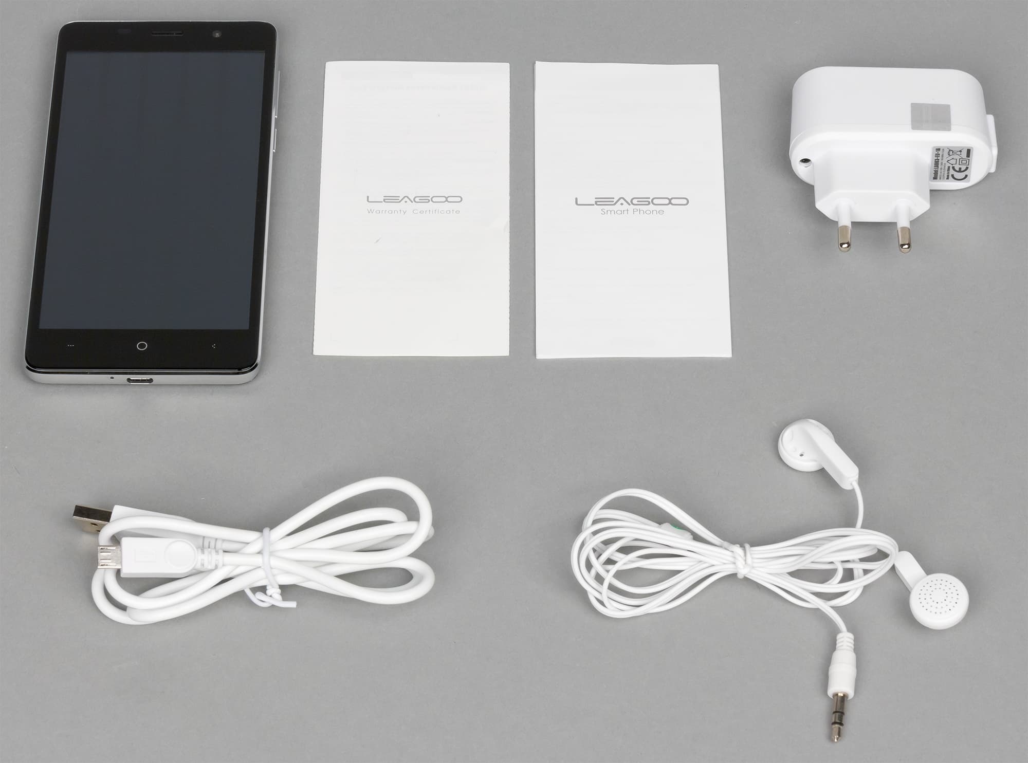 В комплекте у Leagoo M5 есть сетевое зарядное устройство с максимальным выходным током 1 А при напряжении 5 В, соединительный USB-кабель, а также проводная стереогарнитура бросового качества и пара тонких книжиц бумажной документации.