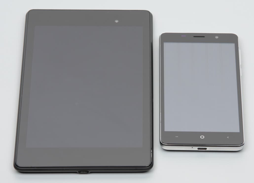 Лицевая поверхность экрана выполнена в виде стеклянной пластины с зеркально-гладкой поверхностью, устойчивой к появлению царапин. Судя по отражению объектов, антибликовые свойства экрана гораздо хуже, чем у экрана Google Nexus 7 (2013) (ниже просто Nexus 7). Для наглядности приведем фотографию, на которой в выключенных экранах отражается белая поверхность (слева — Nexus 7, справа — Leagoo M5, далее их можно различать по размеру):