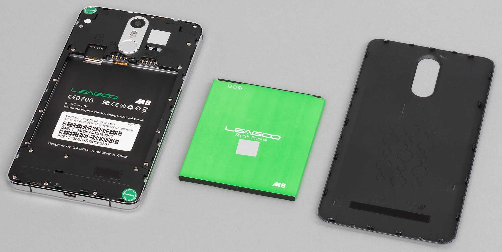 Эта рамка представляет собой широкий плоский ободок, проходящий по всему боковому периметру корпуса. Она не только визуально придает смартфону массивности, но и значительно добавляет веса в реальной жизни. Смартфоны Leagoo — это тот редкий случай, когда, вынимая батарею, практически не ощущаешь уменьшения массы, потому что тут больше всего весит не аккумулятор, а толстенная металлическая рама. К примеру, BQ-6050 Jumbo, о котором пойдет речь в одном из следующих обзоров, имеет куда большую по объему батарею (4900 мА·ч) и 6-дюймовый экран, но весит при этом даже на несколько граммов меньше, чем Leagoo M8 с его 5,7-дюймовым дисплеем и батареей на 3500 мА·ч.