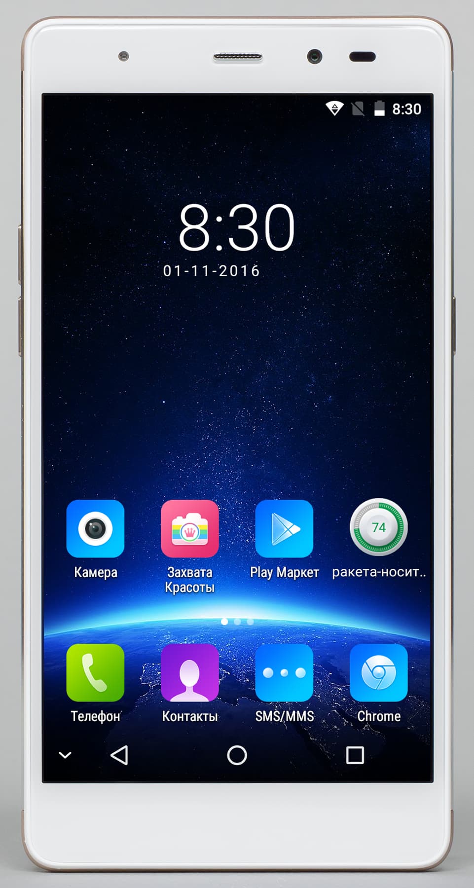 Вообще, отдельно хочется отметить удачное сочетание у Leagoo T1 размеров экрана и всей передней панели в целом: рамка вокруг экрана довольно тонкая, особенно отступ снизу, так что разработчикам удалось добиться минимальных габаритов корпуса для пятидюймового аппарата. Например, точно такой же по строению Wileyfox Swift 2, также лишенный сенсорных аппаратных кнопок, имеет гораздо большее пустое пространство под экраном, отчего корпус выглядит более крупным и длинным. Здесь же получился такой ладненький аппаратик, который так и хочется назвать миниатюрным. Конечно, это не совсем так, но в руке Leagoo T1 действительно умещается лучше многих других современных мобильных устройств.