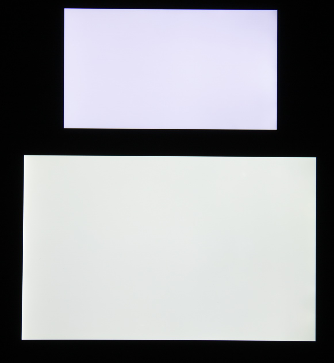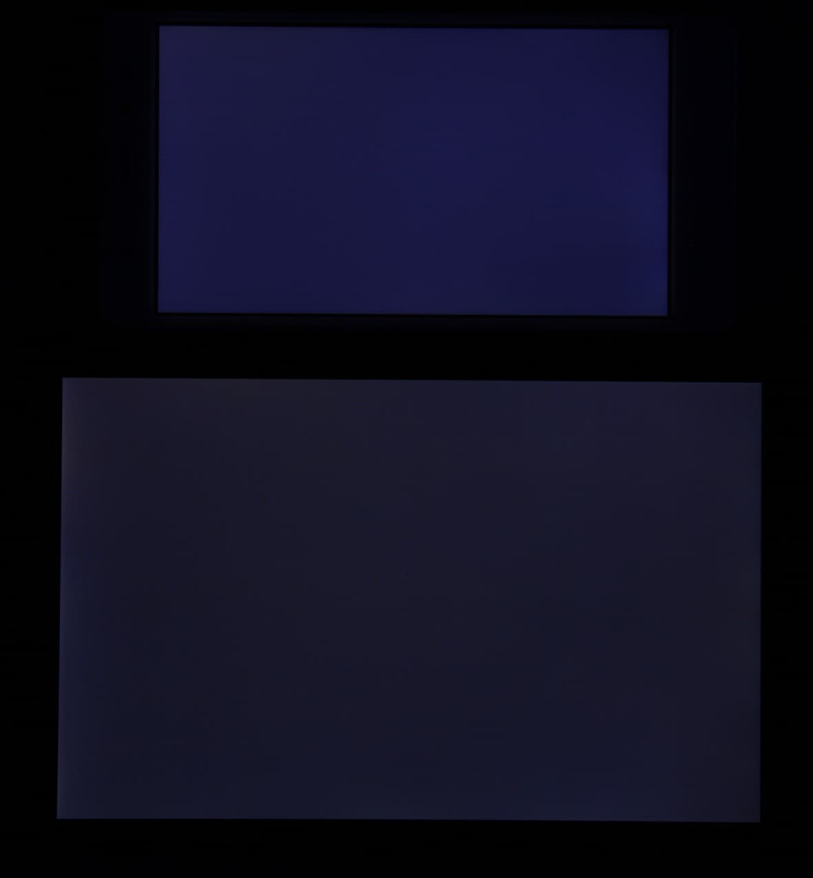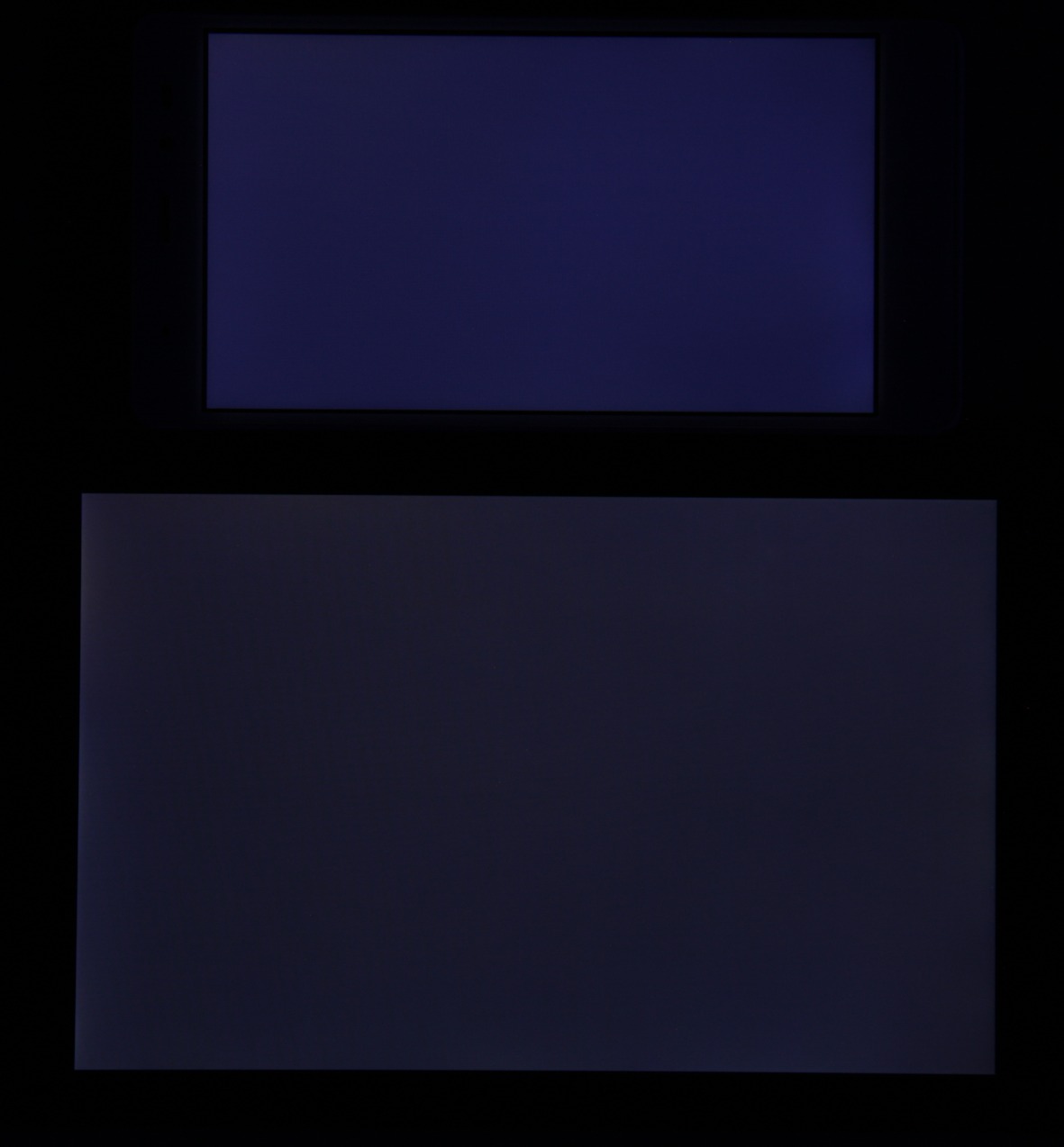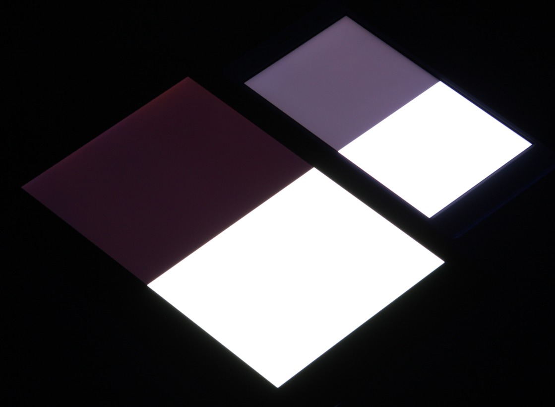 Яркость под углом у экранов уменьшилась (как минимум в 5 раз, исходя из разницы в выдержке), но у Leagoo T1 экран немного темнее. Черное поле при отклонении по диагонали высветляется сильно и приобретает фиолетовый или красно-фиолетовый оттенок. Фотографии ниже это демонстрируют (яркость белых участков в перпендикулярном плоскости экранов направлении одинаковая!):