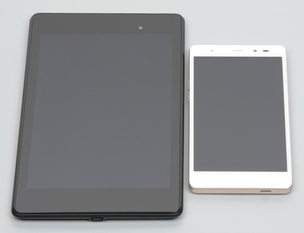 Лицевая поверхность экрана выполнена в виде стеклянной пластины с зеркально-гладкой поверхностью, устойчивой к появлению царапин. Судя по отражению объектов, антибликовые свойства экрана немного хуже, чем у экрана Google Nexus 7 (2013) (ниже просто Nexus 7). Для наглядности приведем фотографию, на которой в выключенных экранах отражается белая поверхность (слева — Nexus 7, справа — Leagoo T1, далее их можно различать по размеру):