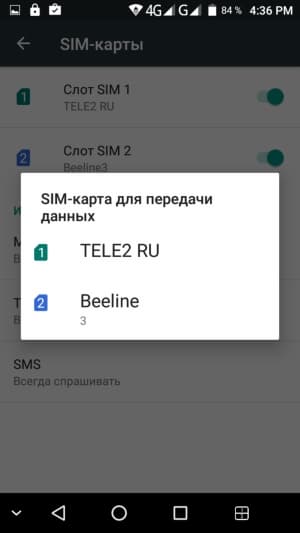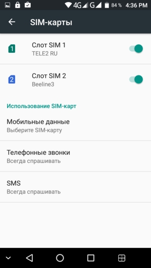 Поддерживается работа с двумя SIM-картами по стандарту Dual SIM Dual Standby, когда обе карты могут находиться в активном режиме ожидания, но одновременно работать не могут — радиомодуль здесь только один. Интерфейс управления SIM-картами стандартно предлагает выбрать для каждой из функций определенную карту заранее или прямо во время соединения. Слоты для карточек по своим возможностям равнозначны.