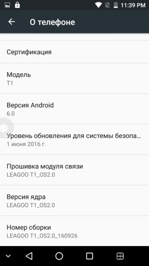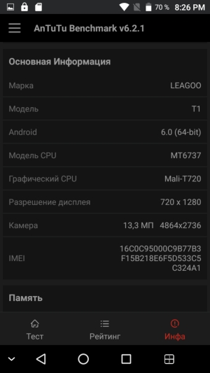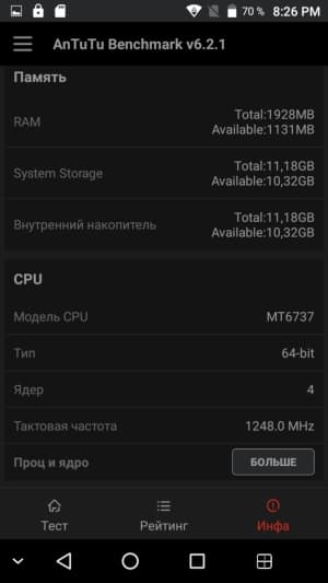Аппаратная платформа Leagoo T1 строится на SoC MediaTek MT6737. В конфигурацию данного чипа входит четыре процессорных ядра Cortex-A53, работающих на частоте до 1,25 ГГц. За обработку графики отвечает видеоускоритель Mali-T720. Объем ОЗУ составляет лишь 2 ГБ, что по современным меркам немного, а пользовательское хранилище изначально составляет около 11 ГБ из 16. Есть возможность установки карт microSD, официально поддерживается объем до 128 ГБ. На практике наша проверочная карта Transcend Premium microSDXC UHS-1 объемом 128 ГБ была успешно распознана смартфоном. Карту microSD можно использовать для установки приложений, но для этого ее, естественно, придется отформатировать с потерей всех предыдущих данных.