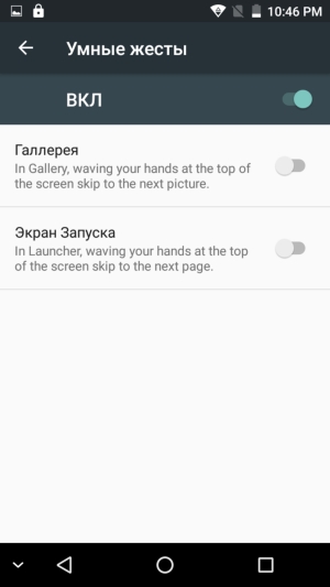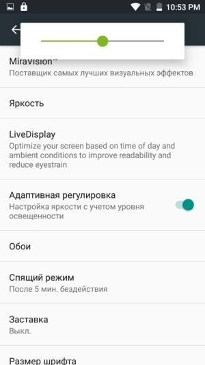 Яркость дисплея можно подстраивать вручную или задействовать автоматическую регулировку, основанную на работе датчика внешнего освещения. Тест AnTuTu диагностирует поддержку 5 одновременных касаний мультитач. Экран можно пробуждать двойным постукиванием по стеклу или начертанием знаков с одновременным переходом к заданным приложениям.