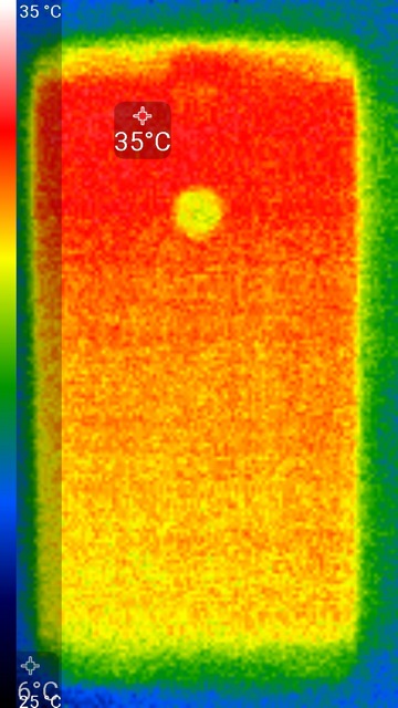Видно, что нагрев локализован в верхней части аппарата, что, видимо, соответствует расположению микросхемы SoC. По данным теплокамеры, максимальный нагрев составил 35 градусов (при температуре окружающего воздуха в 24 градуса), это относительно немного.