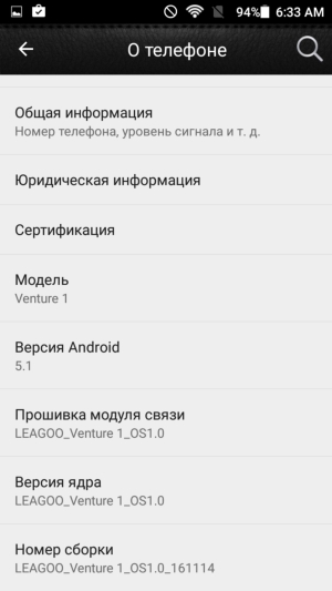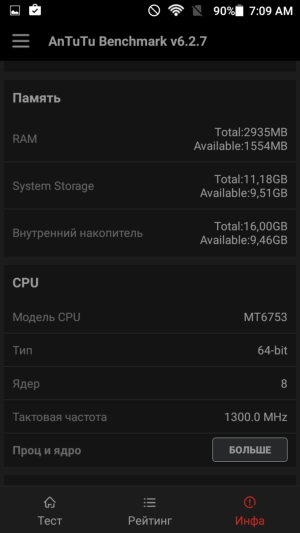 Аппаратная платформа Leagoo Venture 1 строится на базе SoC MediaTek MT6753. В конфигурацию данного чипа входит восемь процессорных ядер Cortex-A53, работающих на частоте до 1,3 ГГц. За обработку графики отвечает видеоускоритель Mali-T720. Объем ОЗУ составляет 3 ГБ, около 2,4 ГБ ОЗУ в реальности свободно после перезагрузки, очистки памяти и закрытия всех приложений. А вот места для файлов и приложений не так много: из 16 ГБ для нужд пользователя доступно не более 10,3 ГБ.