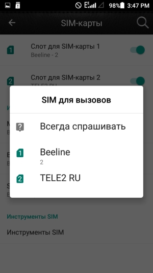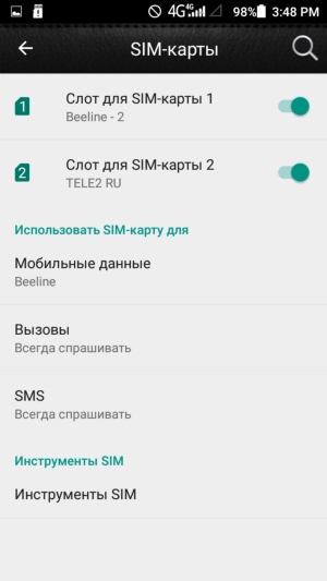 Платформа смартфона не поддерживает одновременную работу с двумя SIM-картами в 3G и 4G. То есть карты таких операторов, как Tele2, не будут работать в 3G на голосовую связь, если под передачу данных в 4G будет выделена карта из другого слота. Интерфейс позволяет выбрать для каждой из функций определенную карту заранее или прямо во время соединения. Работают карты в режиме Dual SIM Dual Standby, радиомодем здесь один.