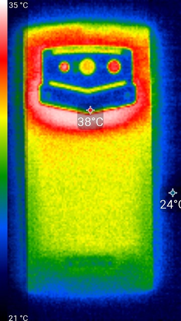 Видно, что нагрев локализован в верхней части аппарата, что, видимо, соответствует расположению микросхемы SoC. По данным теплокамеры, максимальный нагрев составил 38 градусов (при температуре окружающего воздуха в 24 градуса), это не очень много.