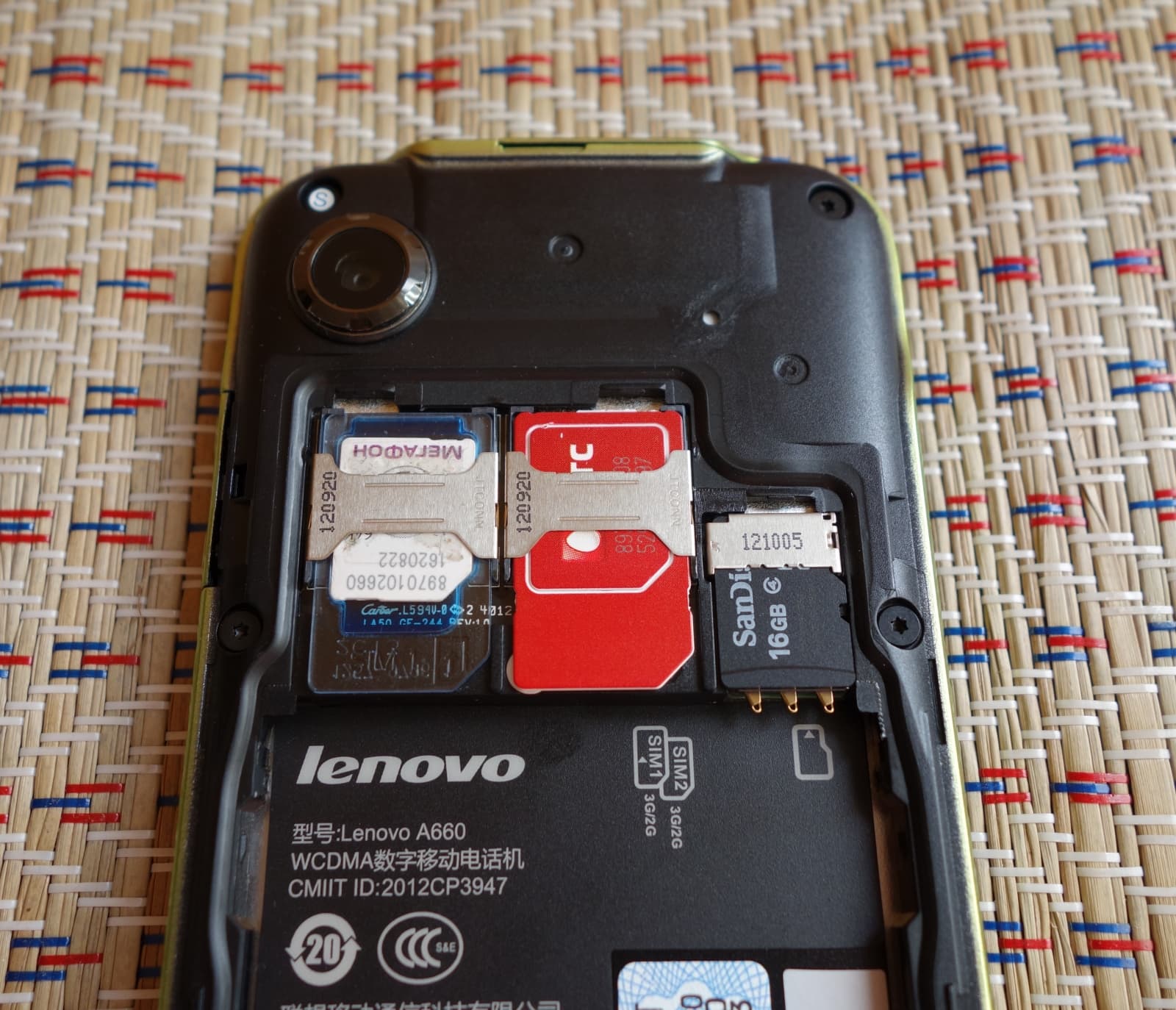 Аккумуляторная батарея здесь съемная, и при установке она подпирает собой все три карточки, когда те вставлены в свои слоты. Соответственно, о горячей замене не может идти и речи.