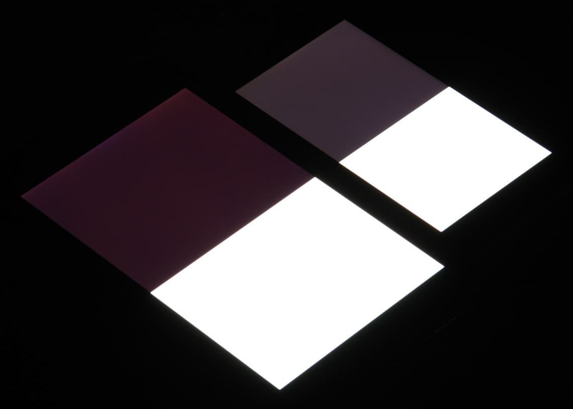 Яркость под углом у экранов уменьшилась (как минимум в 5 раз, исходя из разницы в выдержке), но в случае Lenovo A7000 падение яркости больше. Черное поле при отклонении по диагонали высветляется сильно и приобретает желтоватый или красно-фиолетовый оттенок. Фотографии ниже это демонстрируют (яркость белых участков в перпендикулярном плоскости экранов направлении примерно одинаковая!):