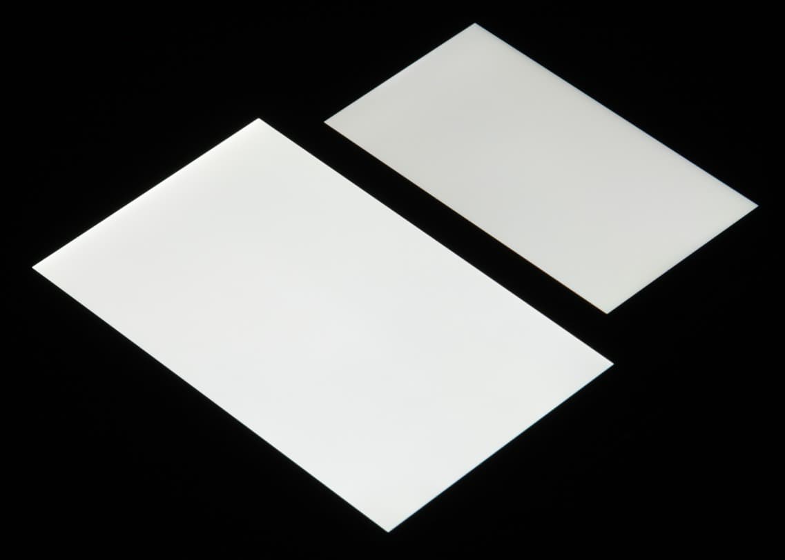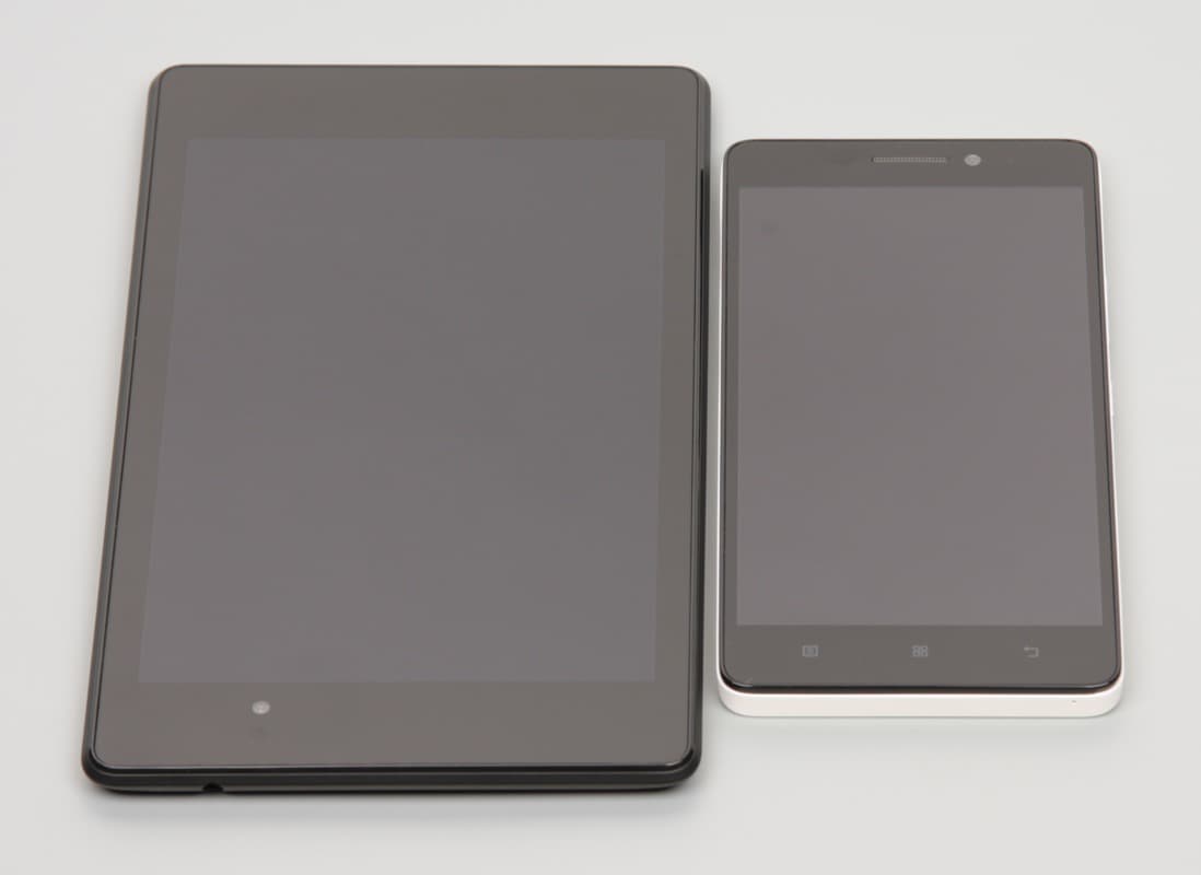 Лицевая поверхность экрана выполнена в виде стеклянной пластины с зеркально-гладкой поверхностью, устойчивой к появлению царапин. Судя по отражению объектов антибликовые свойства экрана не хуже, чем у экрана Google Nexus 7 (2013) (далее просто Nexus 7). Для наглядности приведем фотографию, на которой в выключенных экранах отражается белая поверхность (слева — Nexus 7, справа — Lenovo A7000, далее их можно различать по размеру):