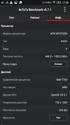 - SoC MediaTek MT6752m, 1,5 ГГц, 8 ядер, ARM Cortex-A53
