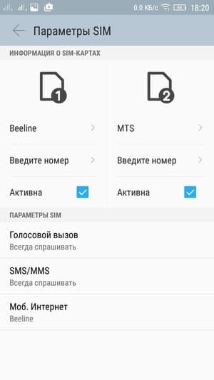 Смартфон поддерживает работу с двумя SIM-картами. Организация работы с ними удобна, все настройки собраны на одной странице. Любую из SIM-карт можно назначить основной для осуществления голосовых звонков, передачи данных или отправки SMS-сообщений. Можно выбрать желаемую карту прямо в момент вызова или отправки SMS. Разъемы для SIM-карт неравнозначны по своим возможностям, скоростную передачу данных в сетях 3G (4G) поддерживает только один слот, об этом необходимо помнить при первоначальной установке SIM-карт.