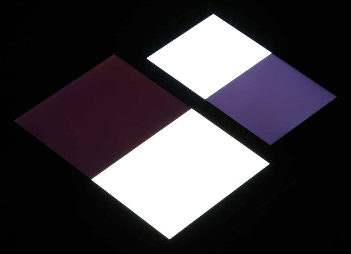 Яркость под углом у экранов уменьшилась (как минимум в 5 раз, исходя из разницы в выдержке), но в случае Lenovo K3 Note падение яркости немного больше. Черное поле при отклонении по диагонали высветляется сильно и приобретает фиолетовый оттенок. Фотографии ниже это демонстрируют (яркость белых участков в перпендикулярном плоскости экранов направлении примерно одинаковая!):
