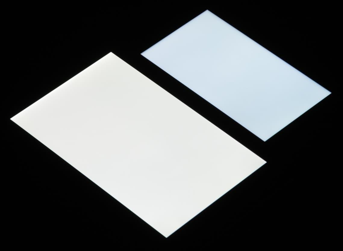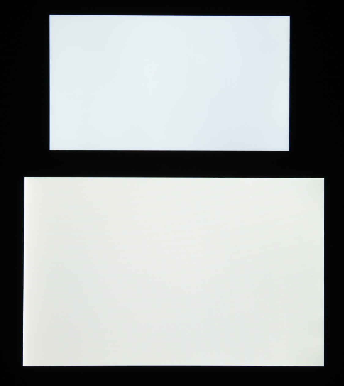 Экран имеет хорошие углы обзора без значительного сдвига цветов даже при больших отклонениях взгляда от перпендикуляра к экрану и без инвертирования (кроме самых-самых темных при отклонении взгляда по одной диагонали) оттенков. Для сравнения приведем фотографии, на которых на экраны Lenovo K3 Note и Nexus 7 выведены одинаковые изображения, при этом яркость экранов изначально установлена примерно на 200 кд/м² (по белому полю во весь экран), а цветовой баланс на фотоаппарате принудительно переключен на 6500 К. Перпендикулярно к экранам белое поле: